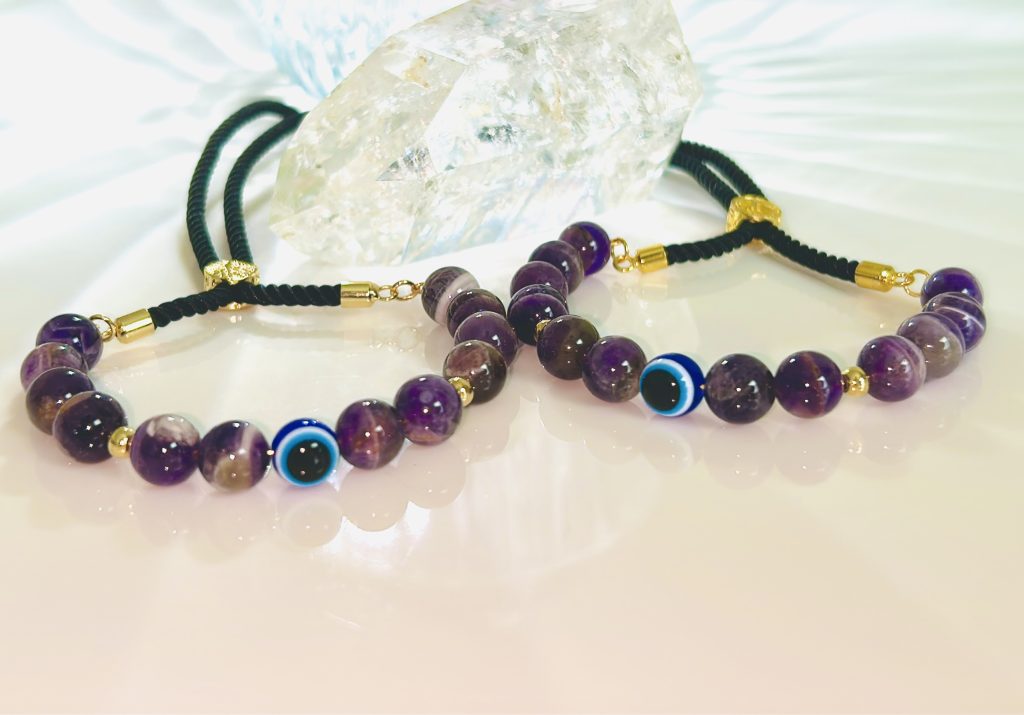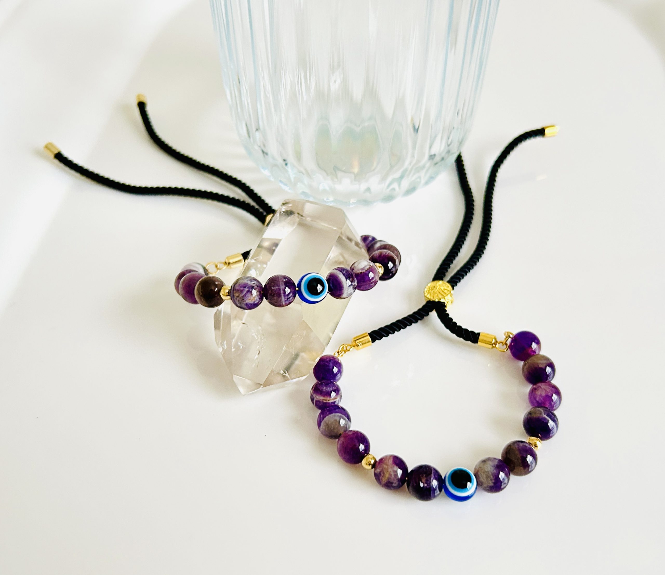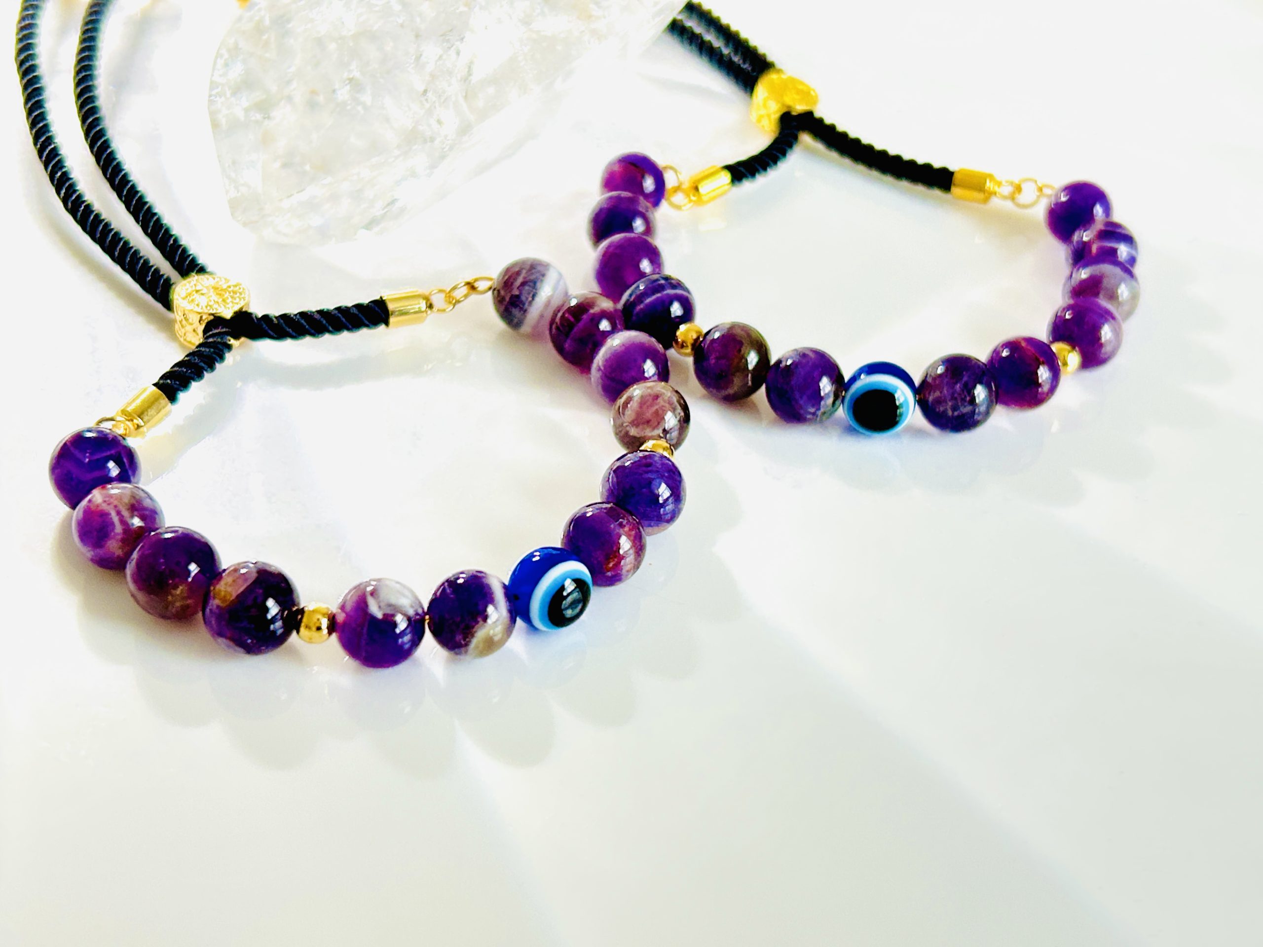 Made with gold plated memory wire, this beautiful Amethyst beaded bracelet is featuring the All Seeing Eye bead making this the ultimate protection bracelet. In addition to its protective energy Amethyst is also great for ushering in calming and relaxing energy while helping one stay creatively in tune.