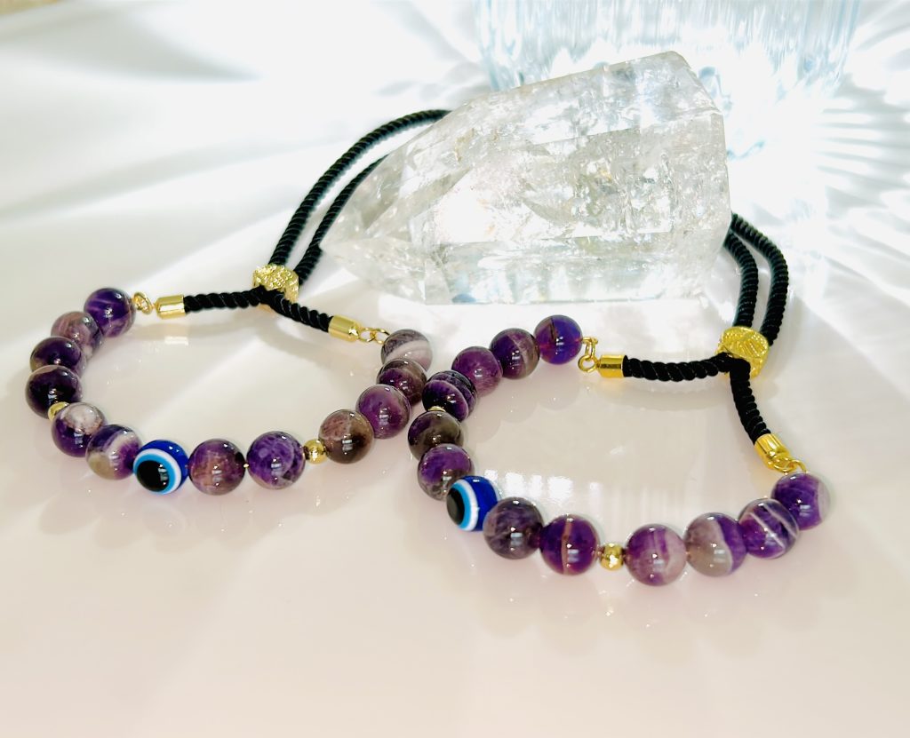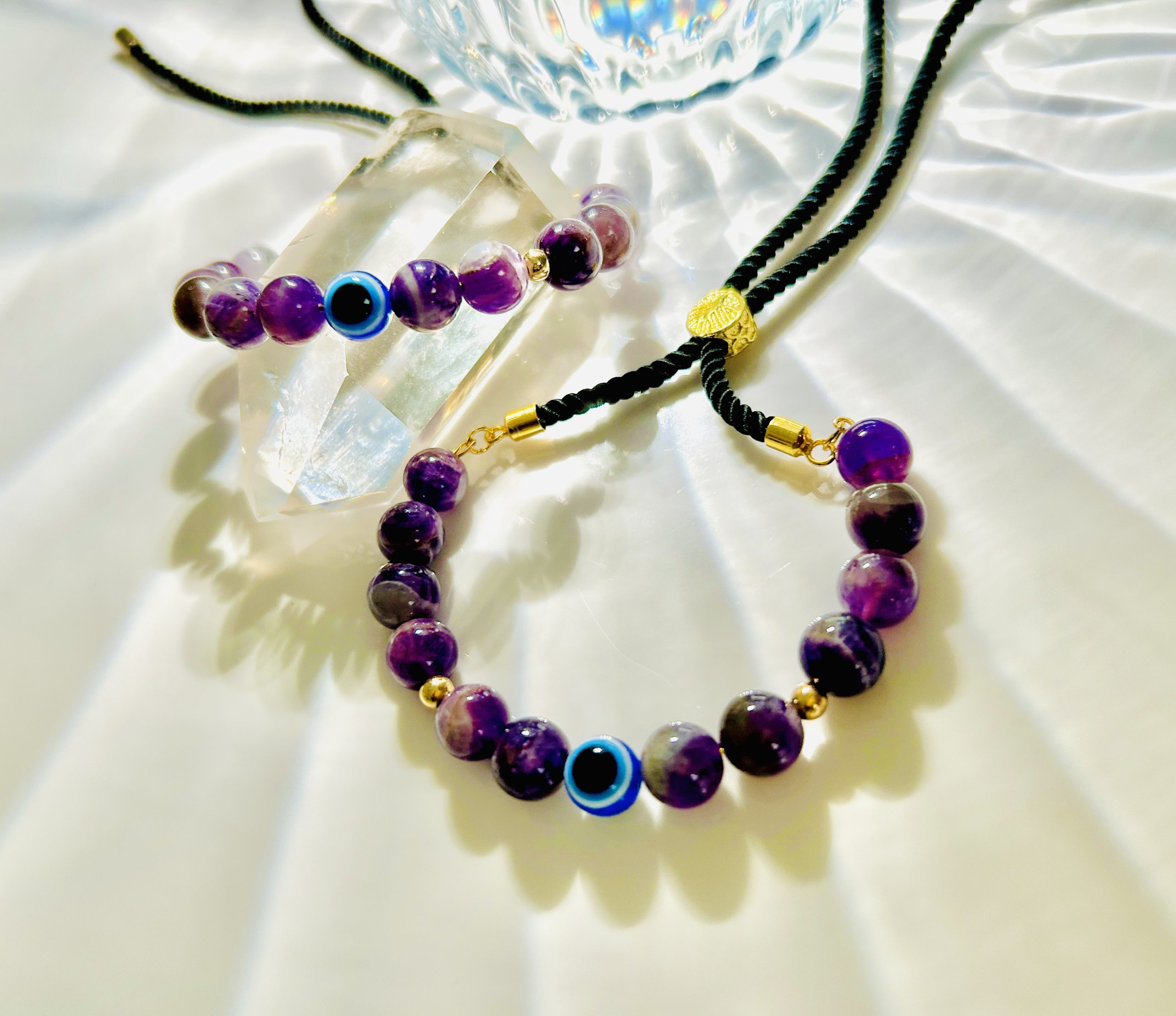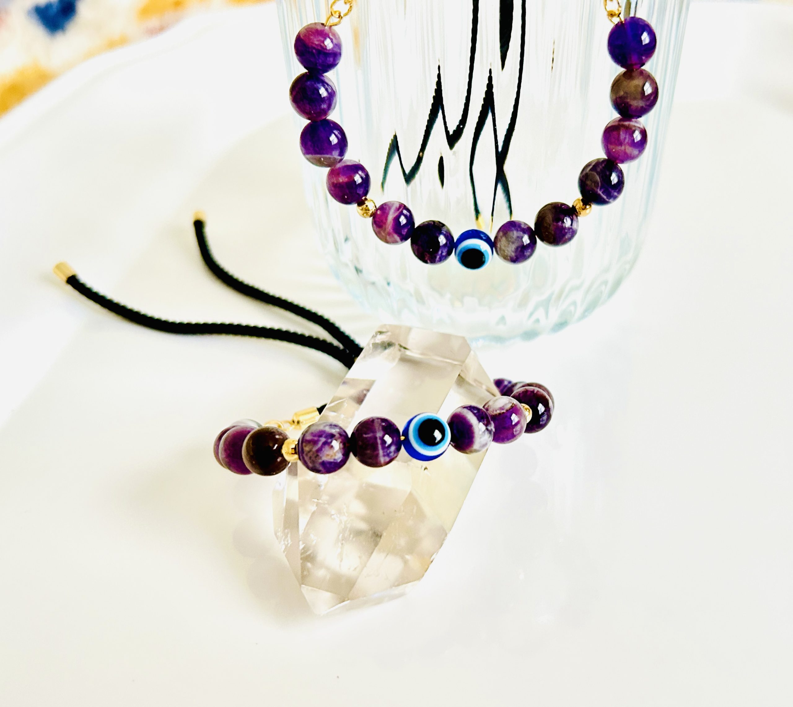 Made with gold plated memory wire, this beautiful Amethyst beaded bracelet is featuring the All Seeing Eye bead making this the ultimate protection bracelet. In addition to its protective energy Amethyst is also great for ushering in calming and relaxing energy while helping one stay creatively in tune.