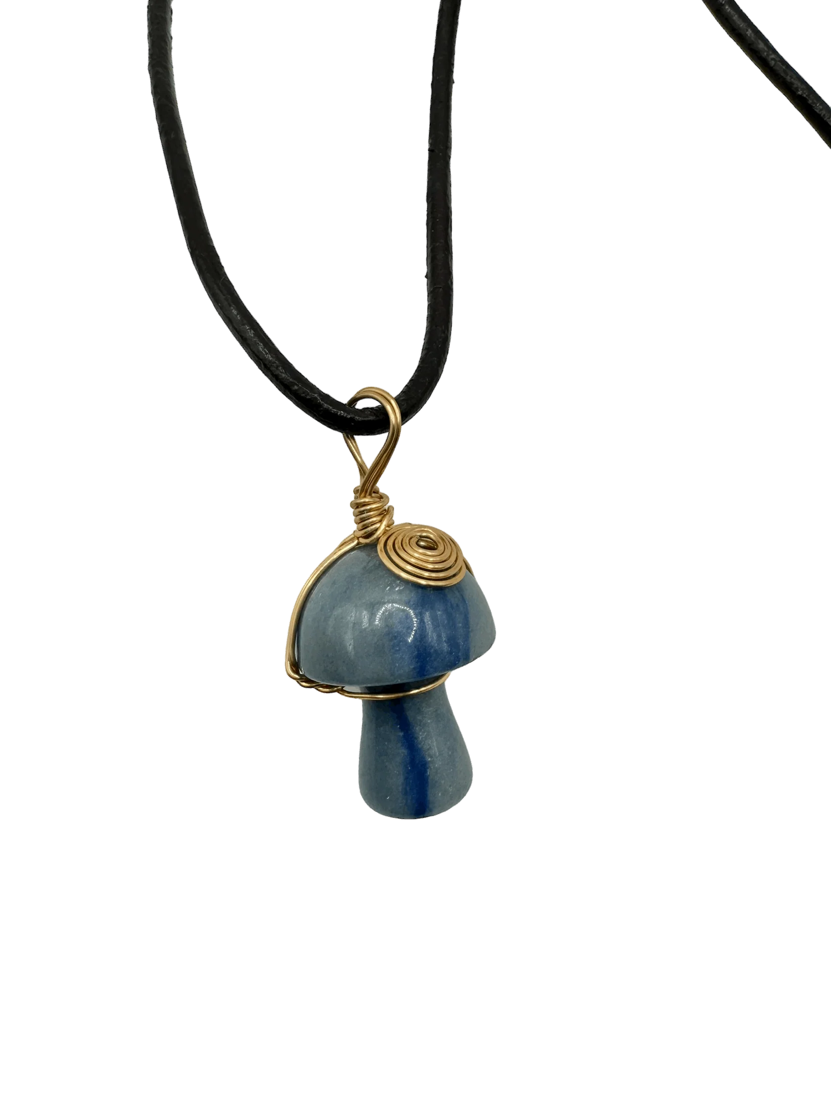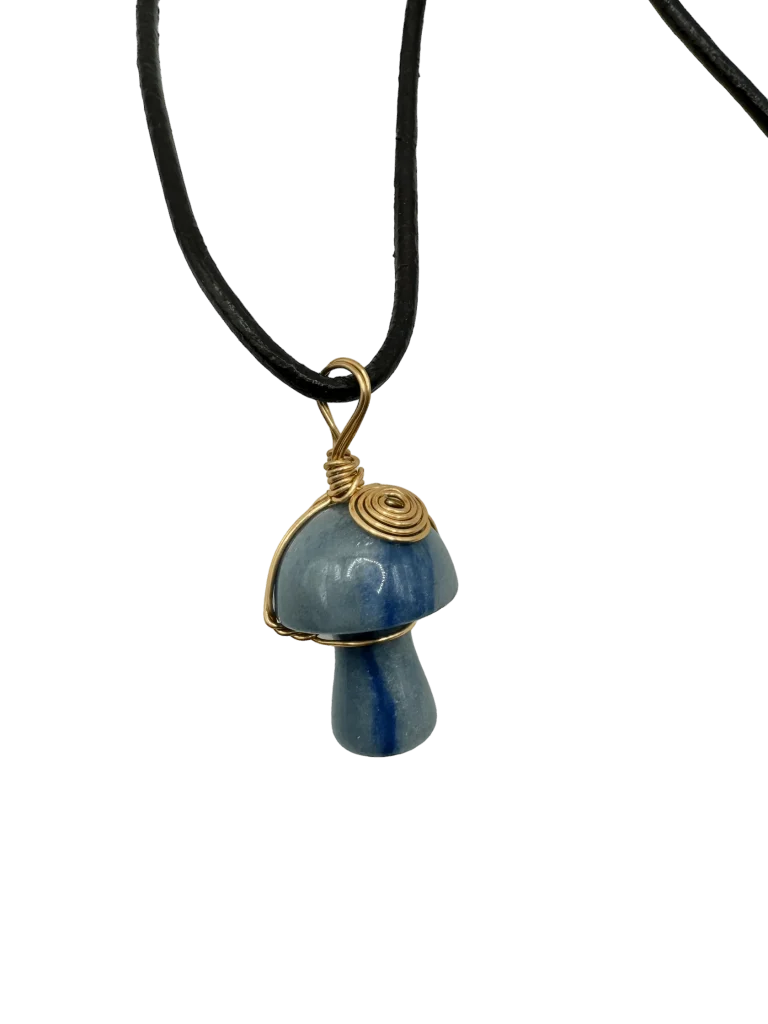 Embrace the beauty of nature with our Blue Aventurine Mushroom Amulet, a unique and enchanting piece that blends organic charm with refined elegance. This exquisite amulet features a delicately craved mushroom shaped blue aventurine stone, meticulously wrapped in glimmering gold wire for a touch of sophistication.
