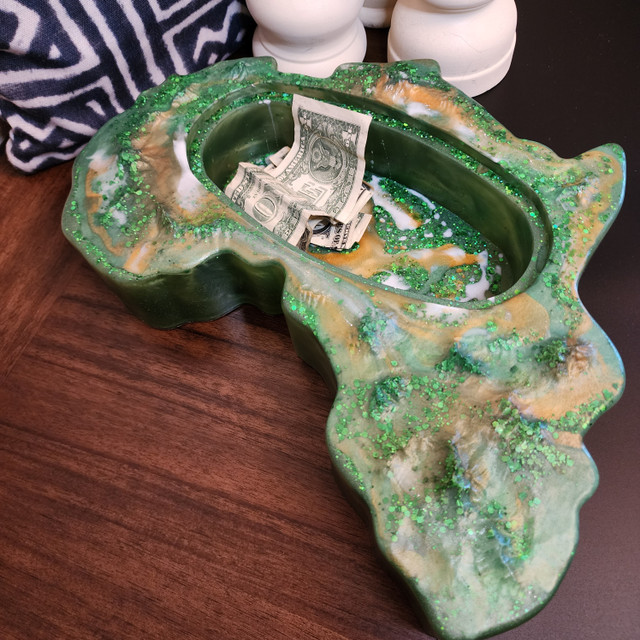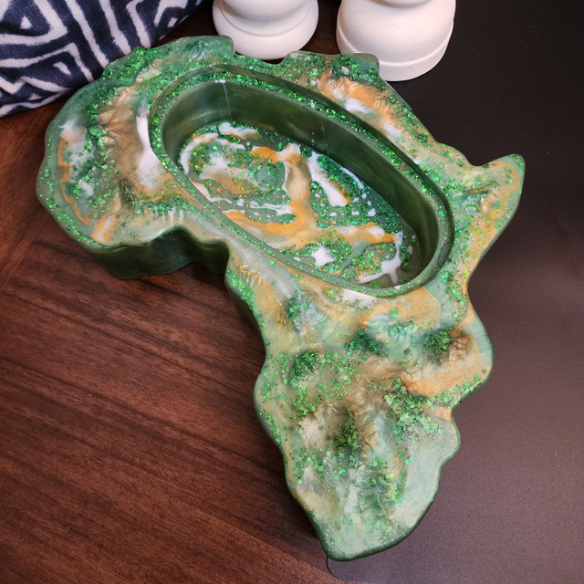 Emerald City is a one-of-a-kind, hand-crafted resin art piece shaped like the African continent. Its vibrant emerald hue, complemented by luxurious gold and white marbling, makes it a show-stopping addition to your decor. Perfect for those who appreciate unique and artistic expressions of culture and beauty, this piece adds a touch of sophistication to any space.