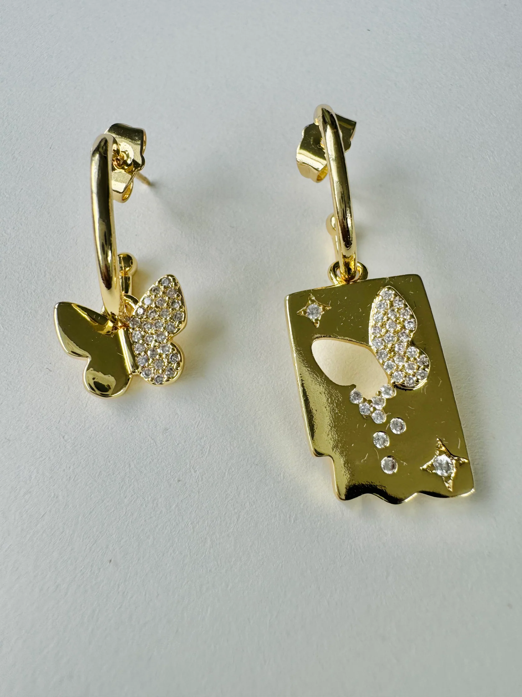 Our 14k gold-filled Fly Pass Hoopsring are here to bring your jewelry game to a whole new level. Featuring a mixed matched set of earrings both featuring shimmering butterfly motifs this earring set them apart from traditional earrings, they are designed to make a statement.