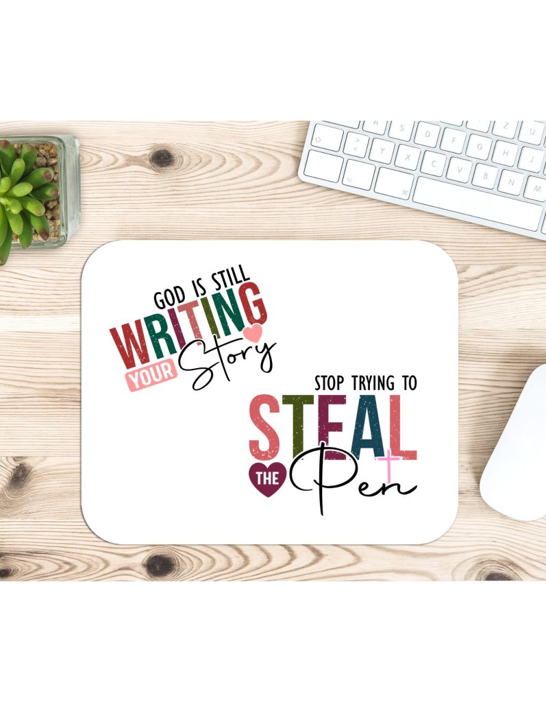 Keep your faith close at work and at home with this matching set featuring the uplifting message “God is Still Writing Your Story” and “Stop Trying to Steal the Pen.” This Christian desk accessory is perfect for believers who want to surround themselves with reminders of God’s plan. The mouse pad brings inspiration to your workspace while the coordinating t-shirt lets you wear your faith. Great for personal use or as a thoughtful gift for fellow Christians.
