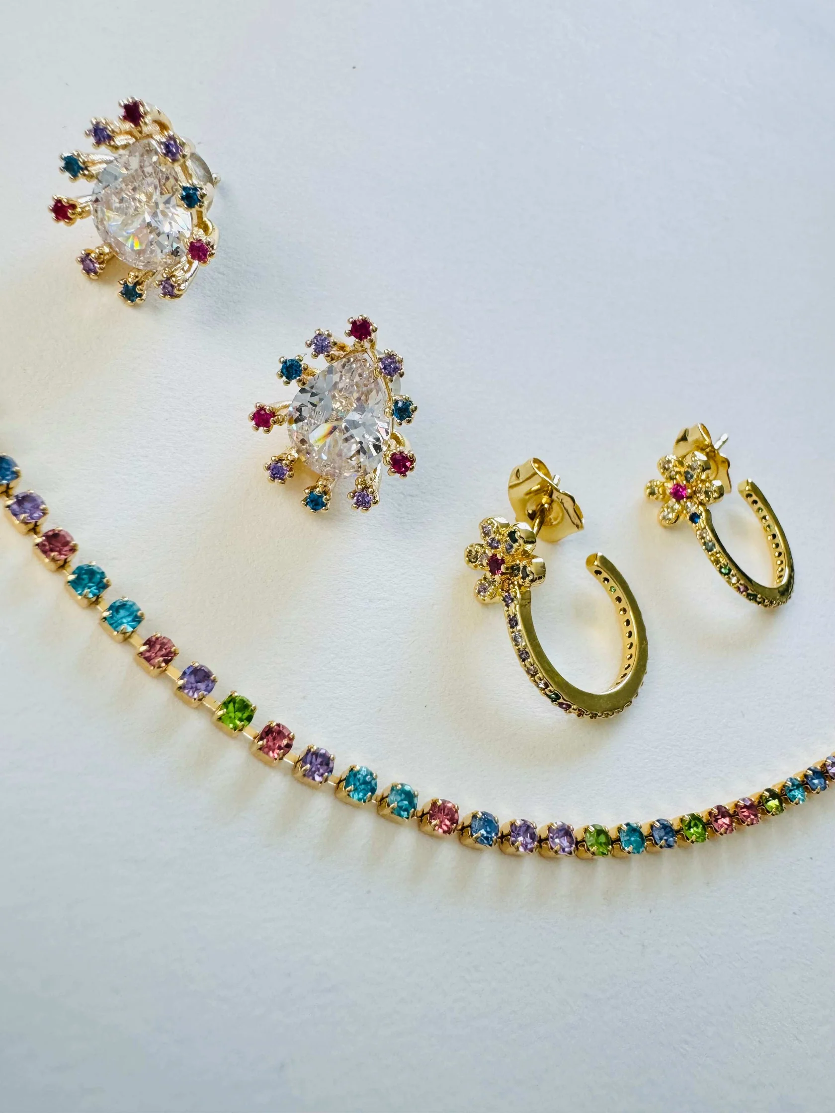 Our 14k gold-filled Hard Candy studs earrings are here to bring your jewelry game to a whole new level. Featuring a pear shaped stone surrounded by a rainbow assortment of shimmering CZs these studs set them apart from traditional earrings, these studs are designed to make a statement.