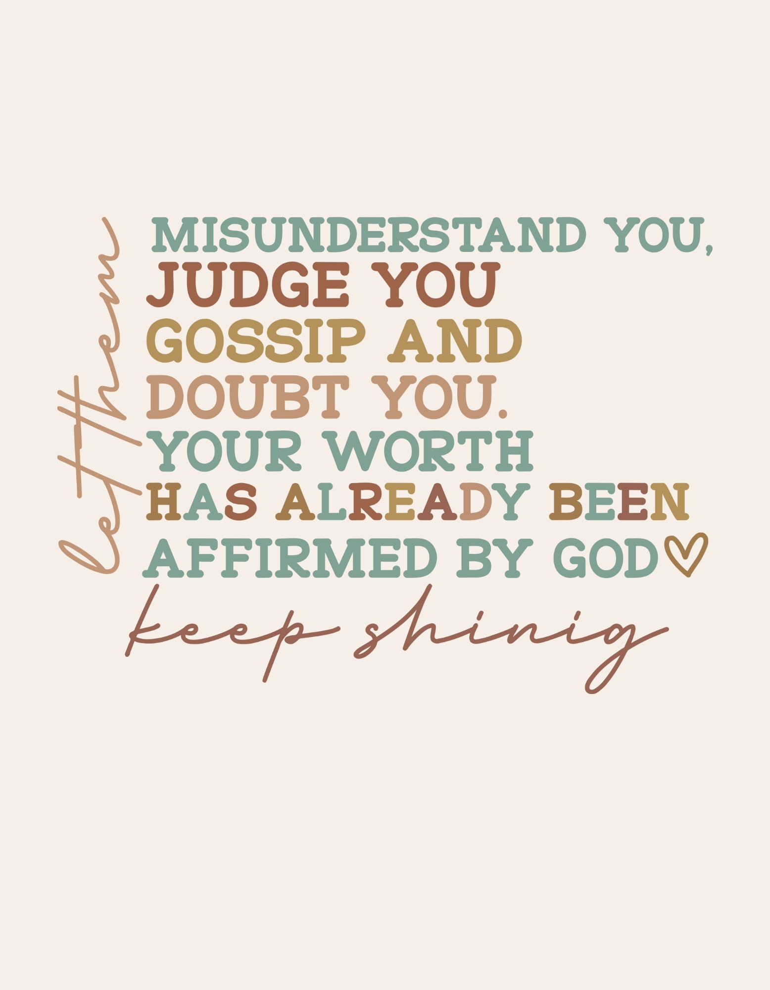 Embrace your God-given worth with this powerful inspirational t-shirt featuring the uplifting message: “Let them misunderstand you, judge you, gossip and doubt you. Your worth has already been affirmed by God. Keep shining.” Perfect for Christian women who want to wear their faith proudly and inspire others. Made from soft, comfortable cotton blend fabric in a beautiful cream color with colorful text design. Ideal for church, casual outings, or as a meaningful gift for someone who needs encouragement.